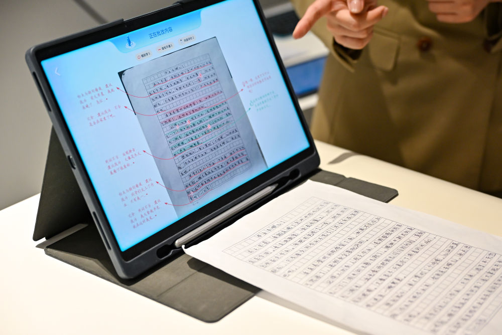 7月2日,在安徽合肥科大讯飞人工智能体验馆,一名工作人员在介绍AI学习机的智能批改功能。新华社记者 张铖 摄