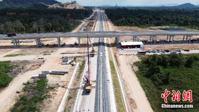 当地时间2024年5月9日,马来西亚东海岸铁路四电系统工程开工仪式在登嘉楼州举行。图为施工现场。(无人机照片)中新社记者 陈悦 摄