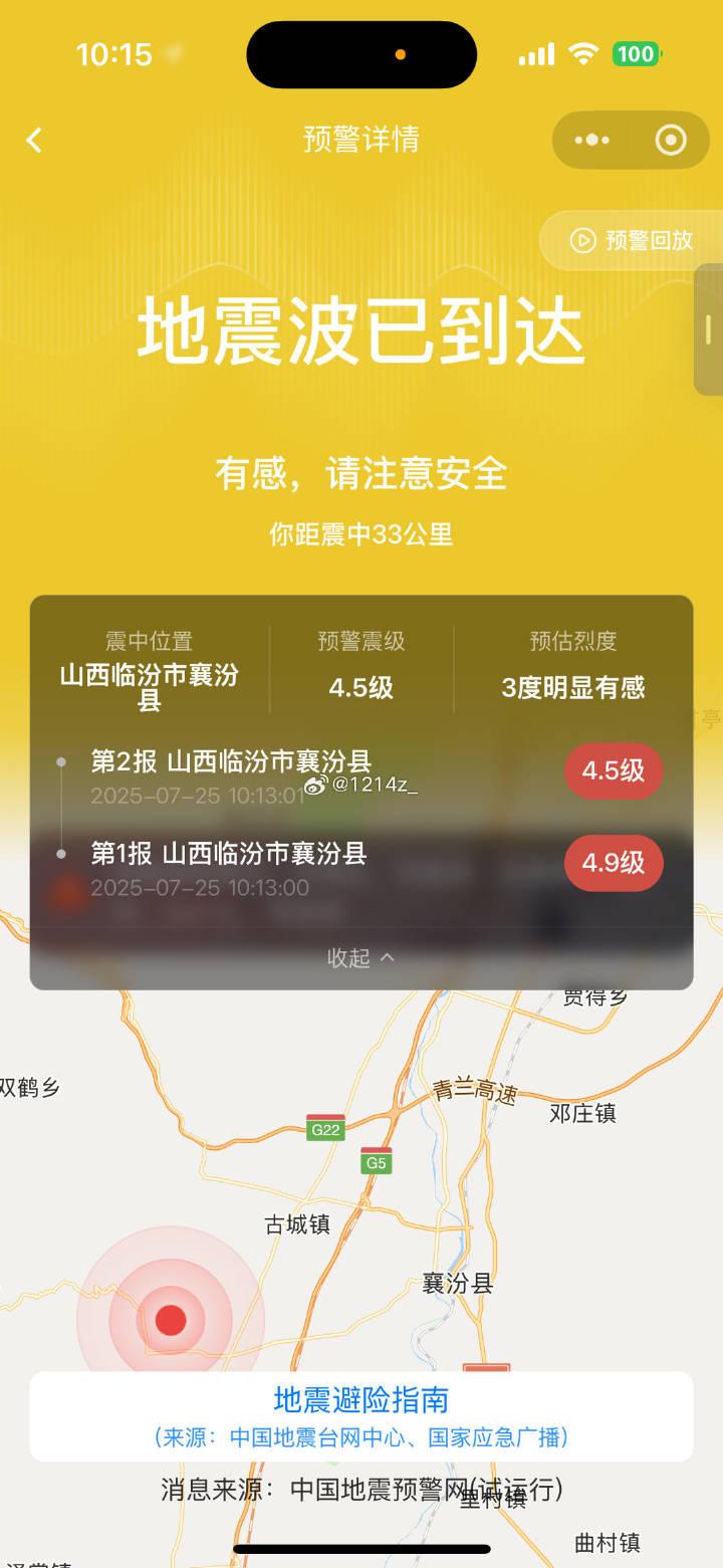 中国地震台网正式测定:7月25日10时13分在山西临汾市襄汾县(北纬35.85度,东经111.27度)发生4.2级地震,震源深度19千米。