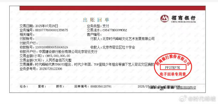 另外,时代峰峻公司代表旗下TFBOYS组合、时代少年团、TOP登陆少年组合等组合及其他艺人,向密云灾区捐款300万元。