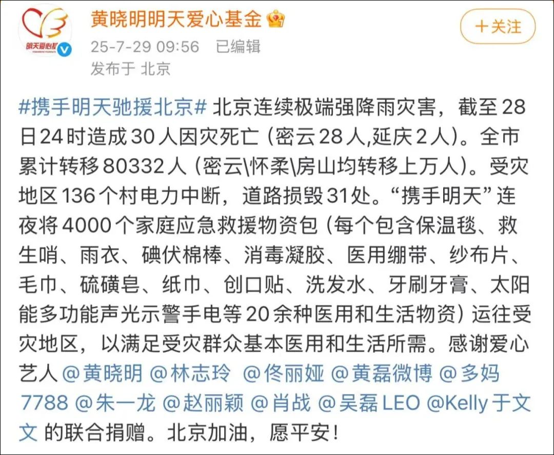 7月29日 ,黄晓明明天爱心基金发文:北京连续极端强降雨灾害,截至28日24时造成30人因灾死亡(密云28人,延庆2人)。全市累计转移80332人(密云/怀柔/房山均转移上万人)。受灾地区136个村电力中断,道路损毁31处。“携手明天”连夜将4000个家庭应急救援物资包(每个包含保温毯、救生哨、雨衣、碘伏棉棒、消毒凝胶、医用绷带、纱布片、毛巾、硫磺皂、纸巾、创口贴、洗发水、牙刷牙膏、太阳能多功能声光示警手电等20余种医用和生活物资)运往受灾地区,以满足受灾群众基本医用和生活所需。