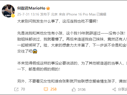 刚刚,何猷君在社交媒体发文: