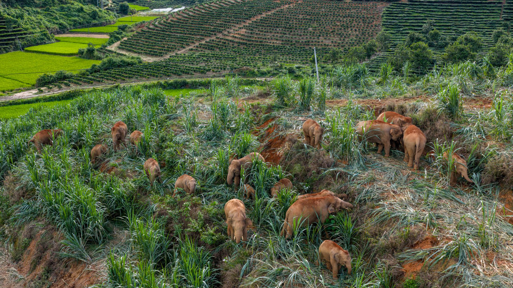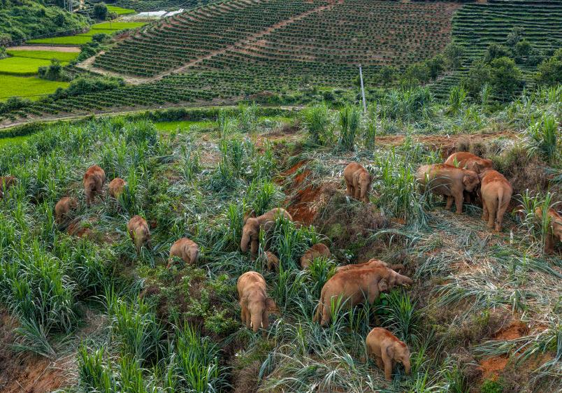 “然然家族”野象群在云南省西双版纳州景洪市大渡岗乡觅食(无人机照片,2025年8月9日摄)。新华社记者 胡超 摄