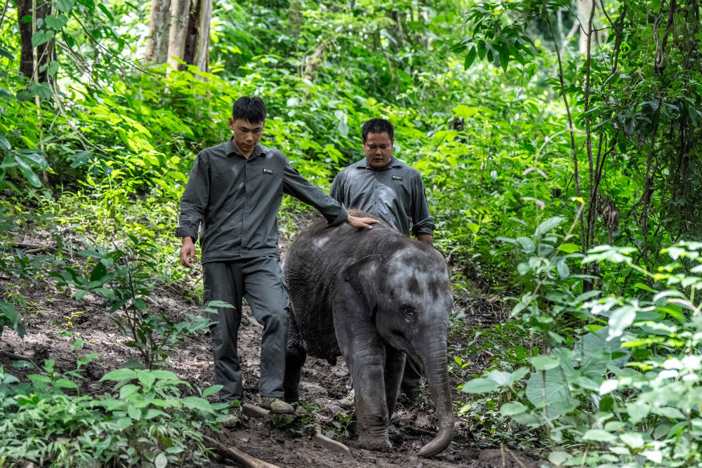 在云南省西双版纳亚洲象救护与繁育中心,工作人员莫诗宇(左)、岩翁罕带小象进行野化训练(8月10日摄)。新华社记者胡超 摄
