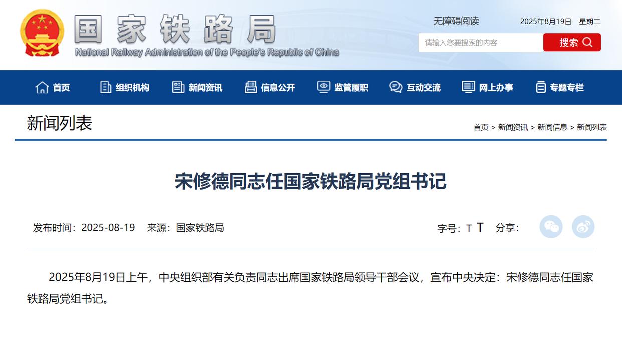 2025年8月19日上午,中央组织部有关负责同志出席国家铁路局领导干部会议,宣布中央决定:宋修德同志任国家铁路局党组书记。