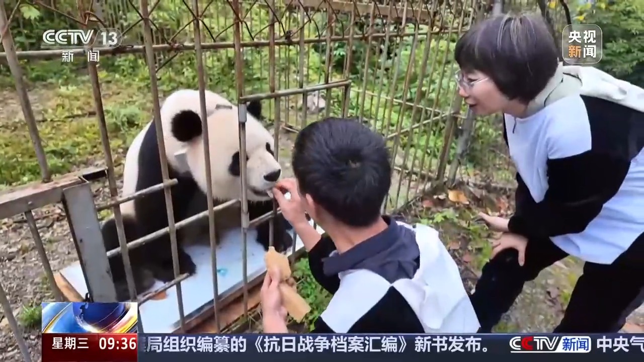 为了密切关注熊猫母子的一举一动,饲养师每天要在野外进行巡逻,给熊猫妈妈补充一些更有营养的精饲料,并进行不定期的“体检”,判断它们的身体状况。