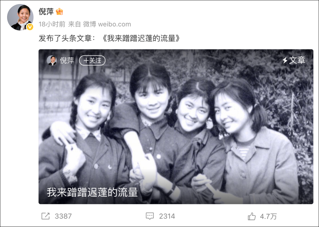 她分享了和迟蓬在山艺读书时的故事,两人曾溜出去看电影《小花》,看完后迟蓬说“我想让你以后成为刘晓庆,我成为陈冲!”倪萍说:“迟儿,还记得你想让自己成为陈冲,想让我成为刘晓庆的那天吗?那晚的满天星星我俩真没白看吧?咱们三个虽然不是最亮的那三颗星星,但咱们一直在闪烁啊!”