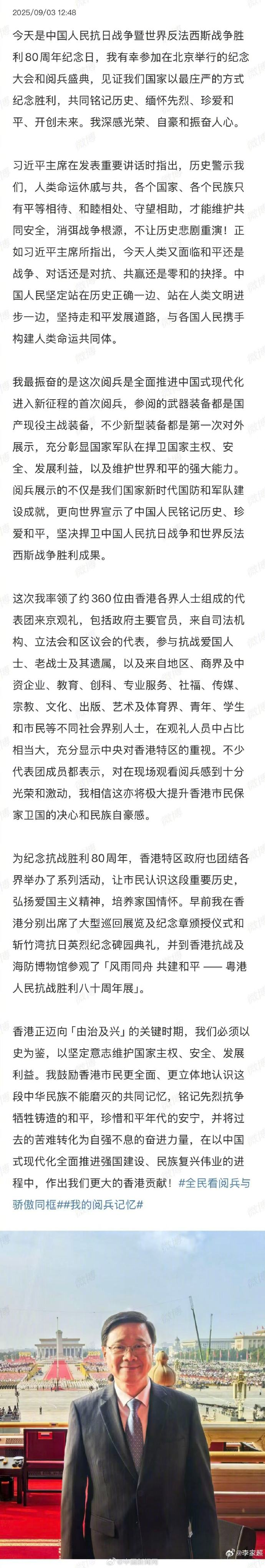 9月3日,香港特别行政区行政长官@李家超 观看阅兵后发文:今天是中国人民抗日战争暨世界反法西斯战争胜利80周年纪念日,我有幸参加在北京举行的纪念大会和阅兵盛典,见证我们国家以最庄严的方式纪念胜利,共同铭记历史、缅怀先烈、珍爱和平、开创未来。我深感光荣、自豪和振奋人心。