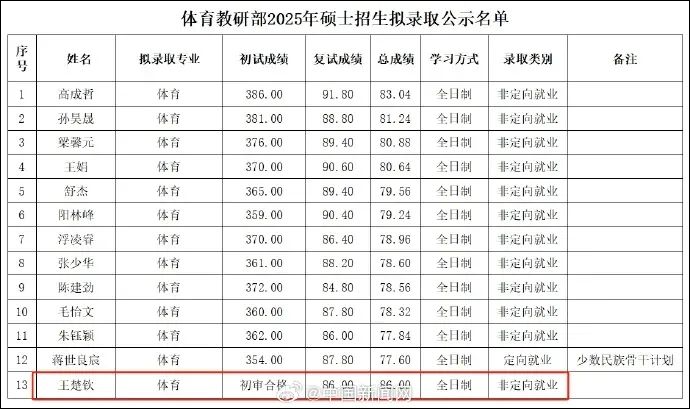据此前报道,4月2日,北大体育教研部2025年硕士招生拟录取公示名单。名单中出现了王楚钦的名字,表格显示初审合格,复试成绩86分,总成绩86分。