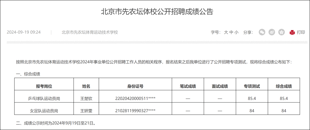 2024年10月28日,北京市体育局官网发布《北京市先农坛体育运动技术学校2024年公开招聘拟聘用人员公示》。