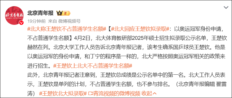 据悉,王楚钦作为北京大学体育教研部非定向全日制体育硕士研究生,已正式入学。
