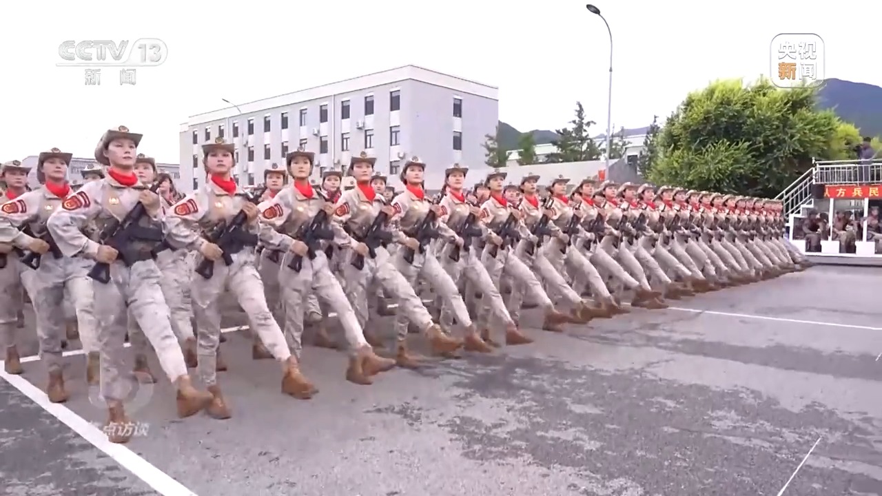民兵方队领队 李依潼:今年跟以往不一样的是我们所参加的是以抗战胜利为主题的活动,所以我们没有像以往国庆阅兵着裙装。红色丝巾,因为我们所有的队员都是从全国的抗日根据地抽组而成的,红色武装了新时代的英雄儿女。