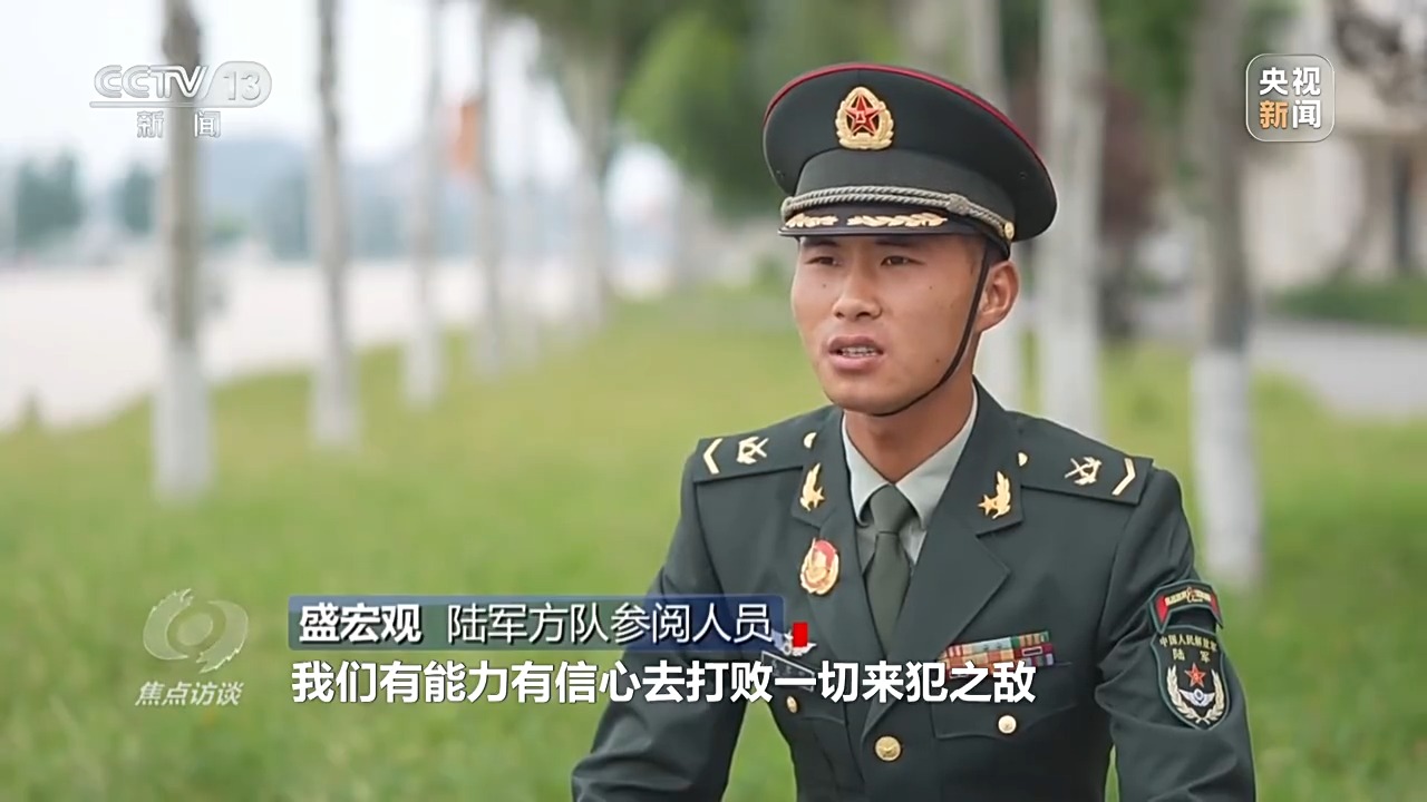 陆军方队参阅人员 盛宏观:抗战先辈能在那种条件下奋勇杀敌,将侵略者赶出中国。我是红军师的一名传人,感到无比骄傲。我们新时代的官兵在接受检阅的时候让党和人民看到,我们是一支能打胜仗的部队,当有一天战争爆发的时候,我们有能力、有信心去打败一切来犯之敌,这就是一种精神传承。