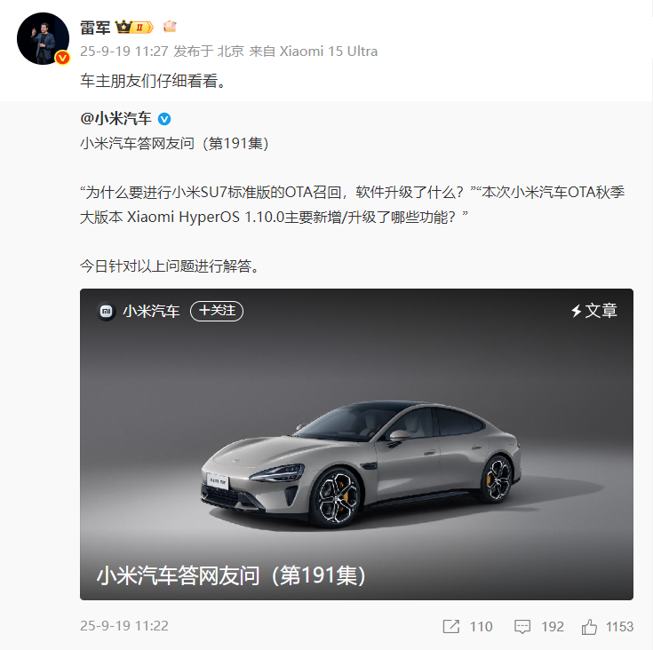 9月19日,小米汽车发文回应 “为什么要进行小米SU7标准版的OTA召回,软件升级了什么?”“本次小米汽车OTA秋季大版本 Xiaomi HyperOS 1.10.0主要新增/升级了哪些功能?” 等问题。