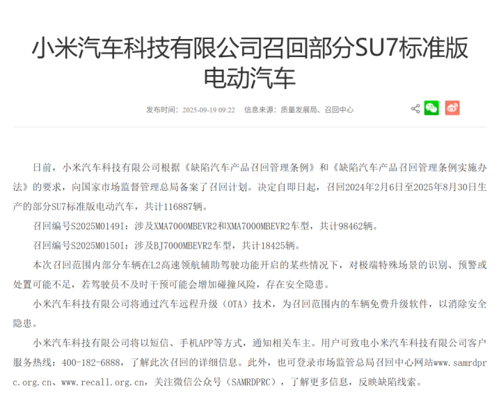 决定自即日起,召回2024年2月6日至2025年8月30日生产的部分SU7标准版电动汽车,共计116887辆。