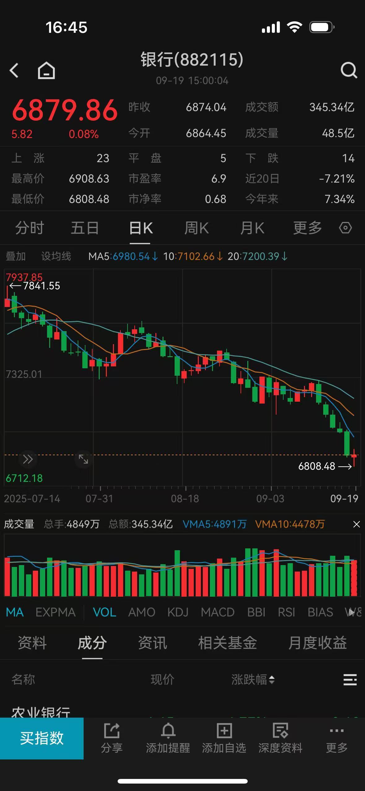 9月19日盘中,A股多只银行股再次走低,工商银行一度跌超2%,近一年来首次跌破半年线(很多投资者将其称为“牛熊分界线”);农业银行、中信银行、中国银行盘中均跌近2%。截至收盘,银行板块指数在连跌5个交易日后,勉强收红,但工行、农行均跌超1%。
