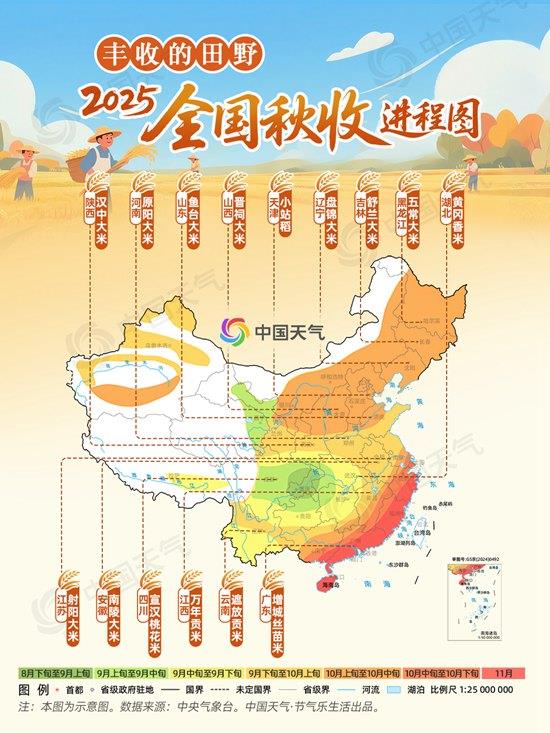一般长江中下游、西南地区和东北地区的一季稻以及江南和华南地区的晚稻,是秋收水稻的重头戏。其中西南地区一季稻在9月成熟,东北地区一季稻在9月中下旬收获,长江中下游一季稻在9月中旬至10月上旬丰收,而最晚的区域是江南和华南地区,晚稻一般在10月下旬至11月中旬开始收割。