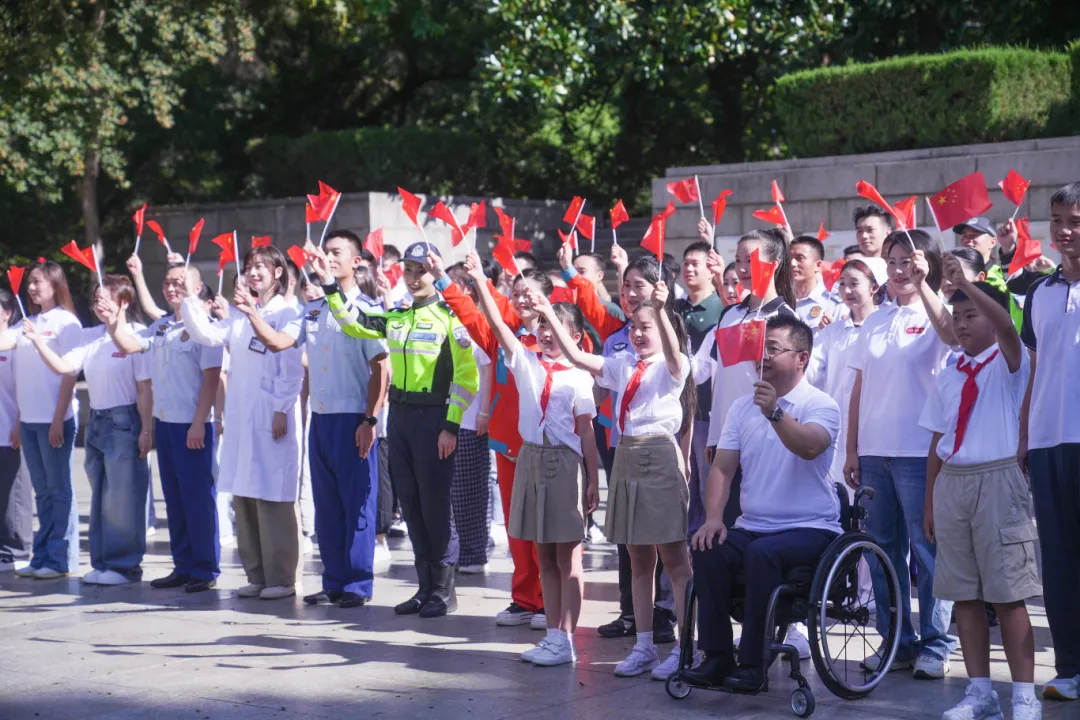五星红旗与金黄秋叶在江岸的街巷间相映