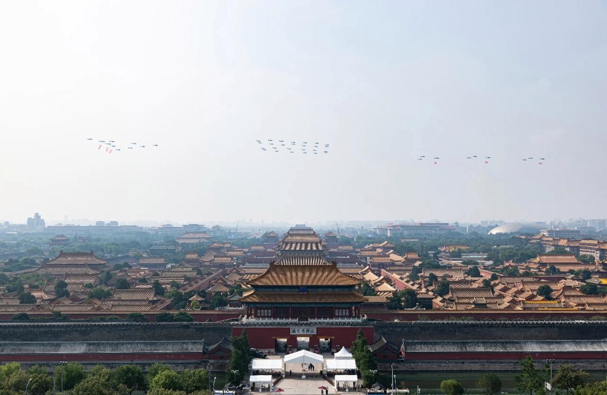中国战鹰列队飞过故宫上空