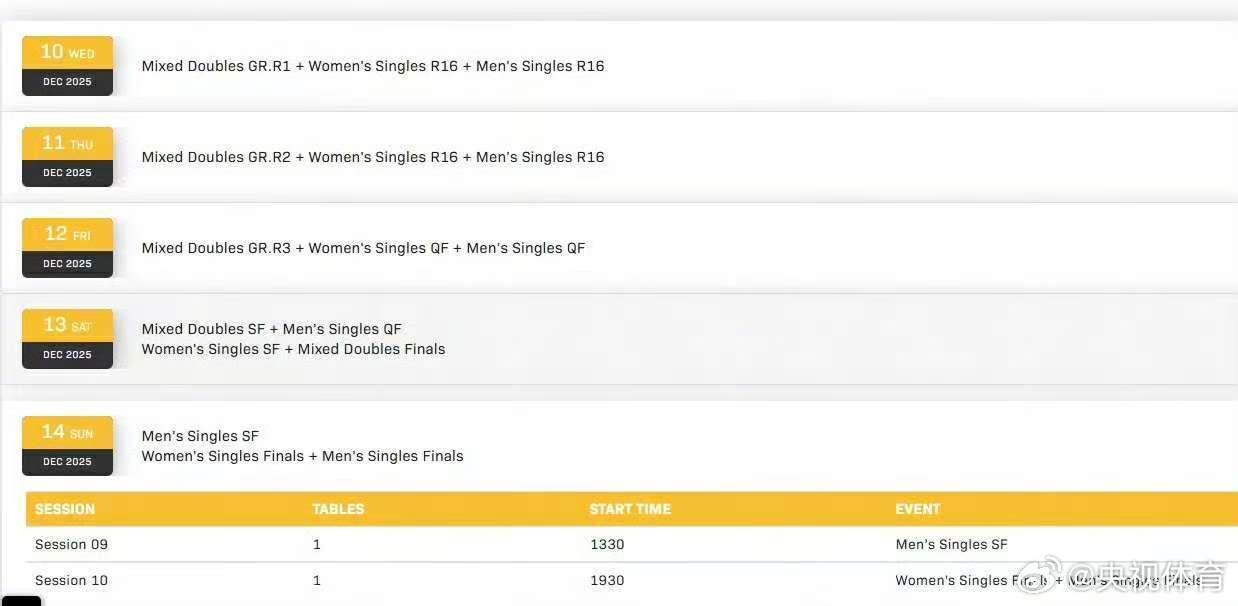 12月13日:混双半决赛,男单1/4决赛,女单半决赛,混双决赛;