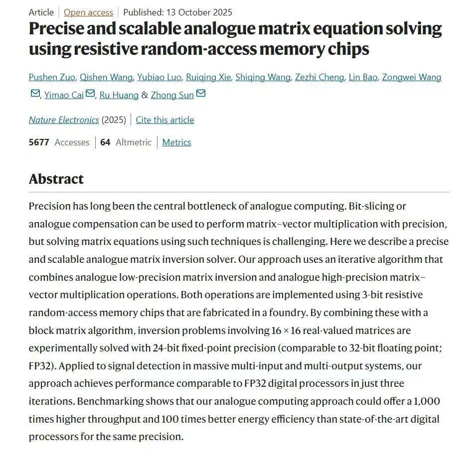 人民日报综合 近日,北京大学人工智能研究院孙仲研究员团队联合集成电路学院研究团队,成功研制出基于阻变存储器的高精度、可扩展模拟矩阵计算芯片,首次实现了在精度上可与数字计算媲美的模拟计算系统。
