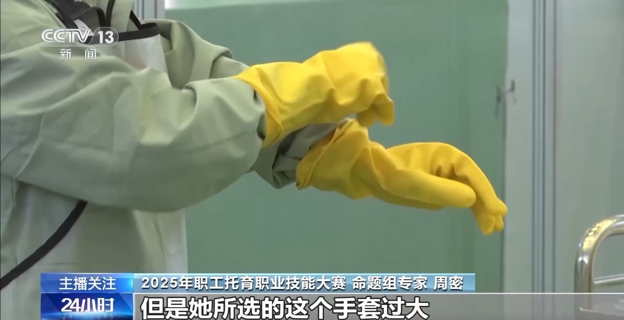2025年职工托育职业技能大赛命题组专家 周密:刚才这位选手的动作基本上都是对的。但是她选的手套过大,所以导致在擦拭过程当中,第一不顺畅,第二手伸入擦拭过的那一面了,这样效果就不是很理想。