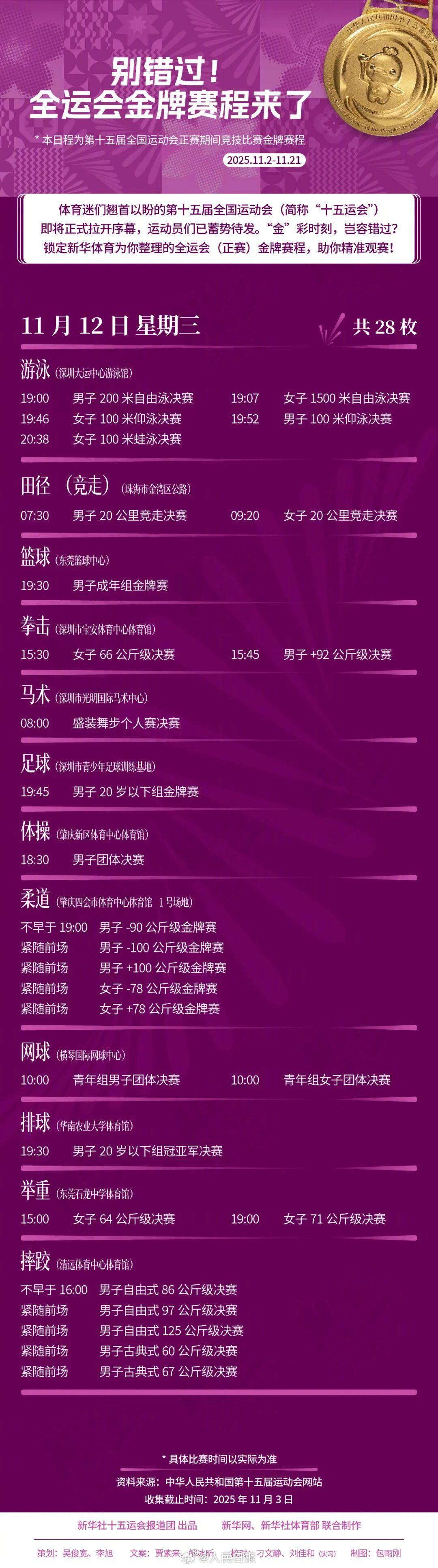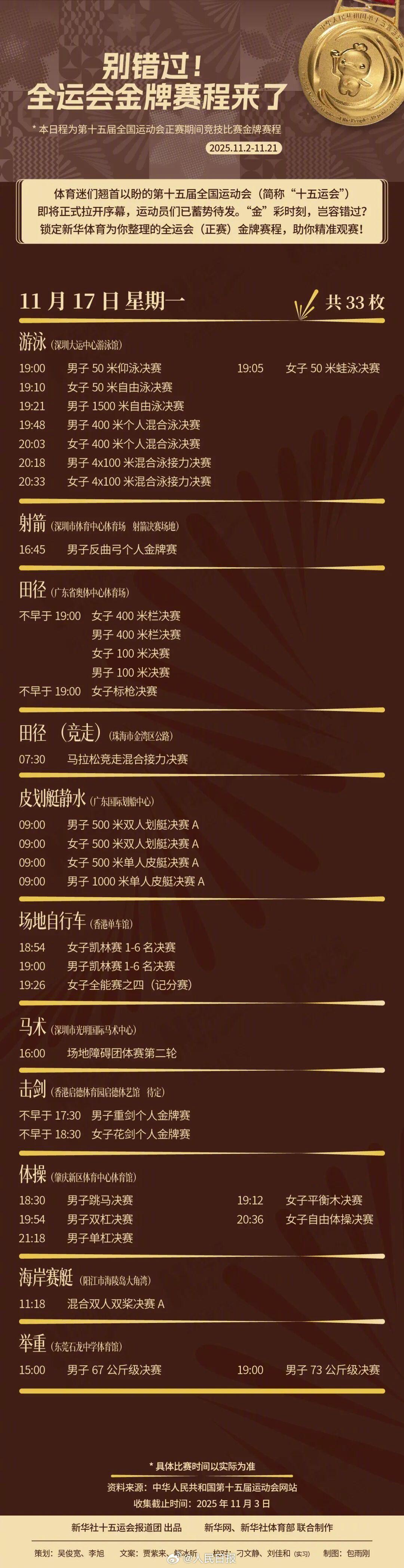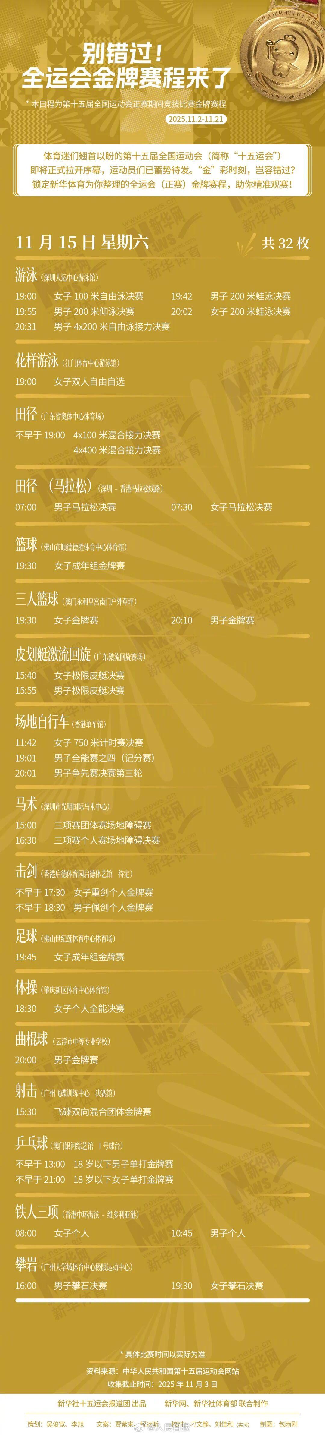 新华网讯 十五运会即将正式拉开序幕,运动员们已蓄势待发。别错过,快收藏这份全运会(正赛)金牌赛程!