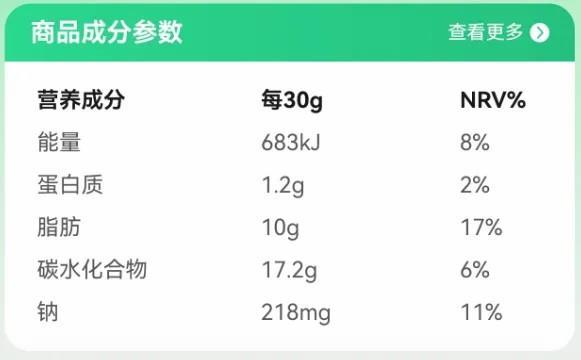 以下面这款薯片为例,图中的含量是每30克的,换算成每100克的含量,相当于含有脂肪33克(约占成年轻体力女性每日推荐摄入量的70%)、钠727毫克(接近每日建议量的50%)。