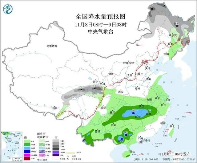 11月8日,内蒙古东北部、东北地区东部和北部、青海南部、甘肃西南部、川西高原北部等地部分地区有小到中雪或雨夹雪,局地有大到暴雪。江汉东部、江南北部、贵州中北部、云南西南部和东部、广西东部和南部等地部分地区有中到大雨,局地有暴雨。