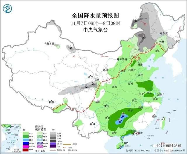 中央气象台预计,11月7日,内蒙古中东部、东北地区西部、青海南部、河北北部等地部分地区有小到中雪或雨夹雪,其中,内蒙古东部等地局地有大雪。河北中部、安徽中北部和东南部、江苏中北部、湖南中西部和南部、江西中部、贵州东部、广西中北部、广东西南部、海南岛东部和南部等地部分地区有中到大雨,局地有暴雨。
