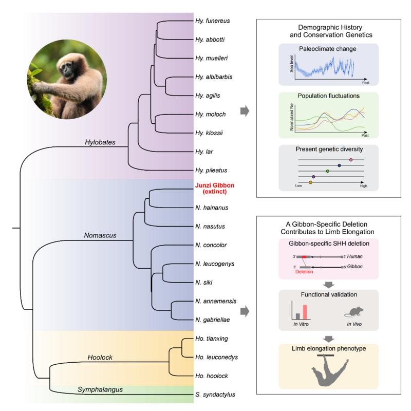 这一发现解决了长臂猿属级分类的百年难题,为理解其快速辐射演化提供了关键框架。此外,从基因组角度进一步夯实了天行长臂猿作为一个独立物种的分类学地位。通过对“君子长臂猿”的古DNA分析,研究证实该物种应归属于冠长臂猿属,而非一个独立的属。这一发现不仅修正了对古代物种的分类认知,也为我们理解长臂猿在各历史时期的物种多样性和地理分布提供了重要线索。