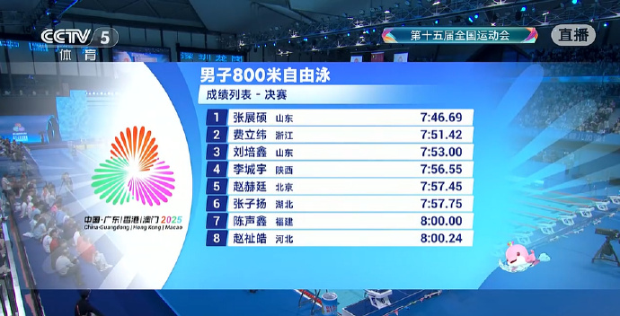 10月13日,十五运会男子800米自由泳决赛,18岁小将张展硕夺得金牌,并打破全国青年纪录。此前,他已获得男子200米自由泳、男子400米自由泳的冠军,均打破全国青年纪录。祝贺!