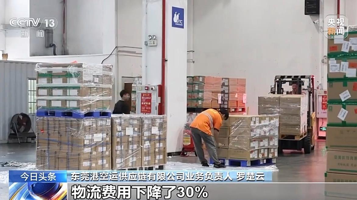 东莞港空运供应链有限公司业务负责人 罗楚云:所有环节实现无缝对接,货物的出厂到上飞机的整体时效缩短了30%,物流费用下降了30%。