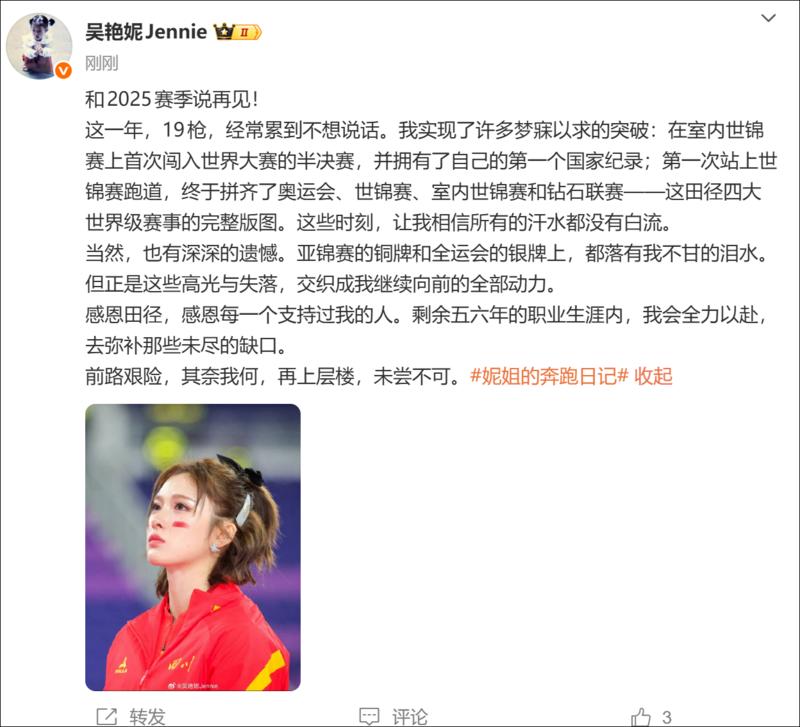 感恩田径,感恩每一个支持过我的人。剩余五六年的职业生涯内,我会全力以赴,去弥补那些未尽的缺口。