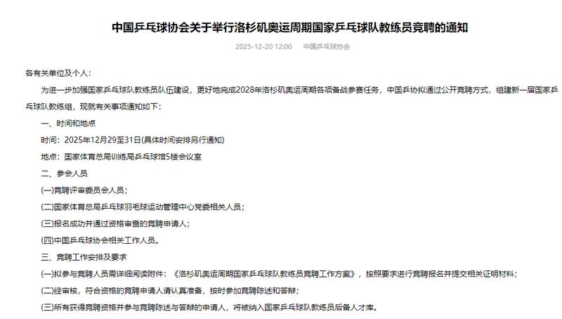 今天,中国乒乓球协会在官网发布《中国乒乓球协会关于举行洛杉矶奥运周期国家乒乓球队教练员竞聘的通知》,正式启动新周期国家队教练员公开竞聘工作。
