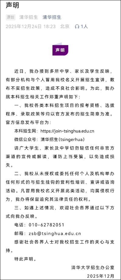 2025年12月24日,清华大学招生办发表声明称,接到多所中学、家长及学生反映,有部分机构与个人冒用该校名义开展招生宣讲,散布不实招生政策,造成不良社会影响。清华大学从未授权或委托任何个人及机构举办任何形式的与招生挂钩的营利性培训、宣讲或咨询活动。