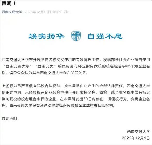 2025年12月10日,西南交通大学发表声明称,该校正在开展学校名称授权使用的专项清理工作,发现部分社会企业擅自使用“西南交通大学”“西南交大”或使用带有特定指向该校的校名组合字样作为企业名称,误导公众认为其与西南交通大学存在关联关系。