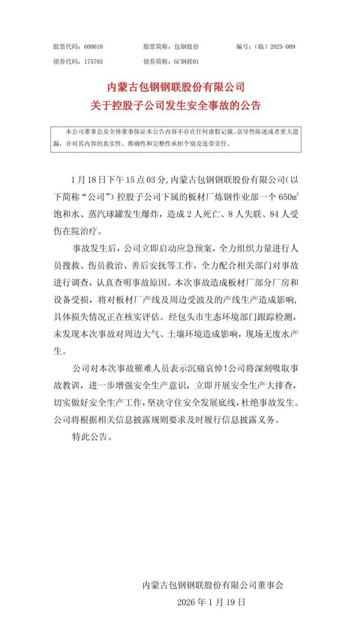 包钢股份1月19日发布《内蒙古包钢钢联股份有限公司关于控股子公司发生安全事故的公告》: