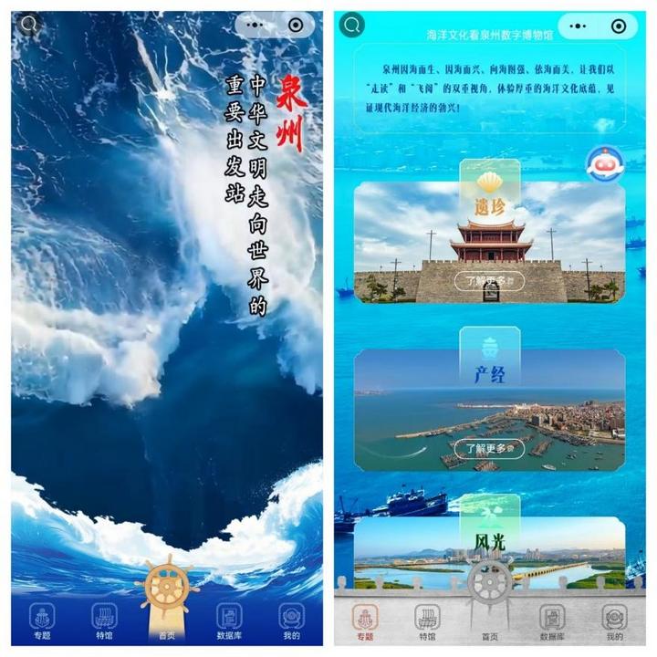 海洋文化看泉州数字博物馆首页(左图)和“专题”栏目(右图)