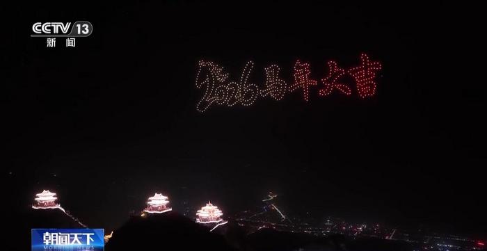 夜幕降临,千架无人机汇聚成流动的星河,在夜空中灵活穿梭。依次勾勒出奔跑的骏马、祥瑞的凤凰,“2026 马年大吉”等字样在天空中织就漫天星光。