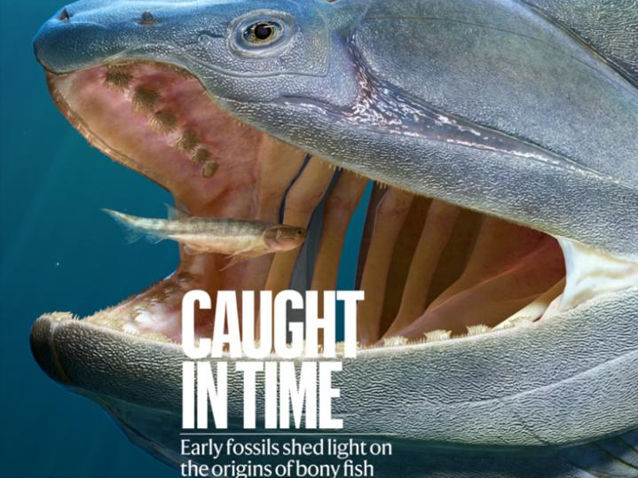 △Nature封面。重庆始骨鱼(小鱼)和钝齿宏颌鱼(大鱼)三维复原图。