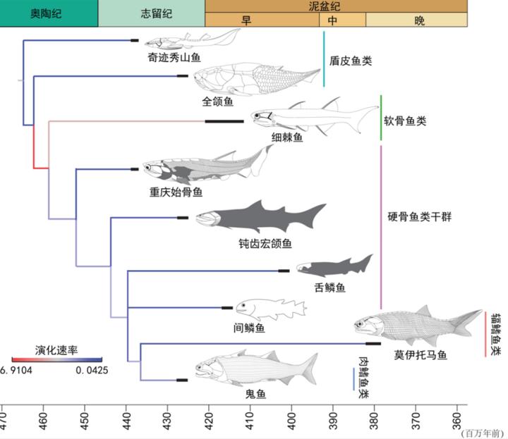 △早期有颌类形态演化,显示重庆始骨鱼和钝齿宏颌鱼在硬骨鱼类干群位置。