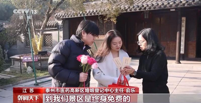 不久前,江苏泰州市雕花楼景区内的婚姻登记点正式对外开放,吸引了不少来自全国各地的新人来这里登记结婚。工作人员为新人们举行了集体颁发结婚证的仪式,送上甜蜜祝福和新春的祝愿,并为每对新人送上精心准备的甜蜜礼包,内含景区门票、文创纪念品等特色伴手礼。