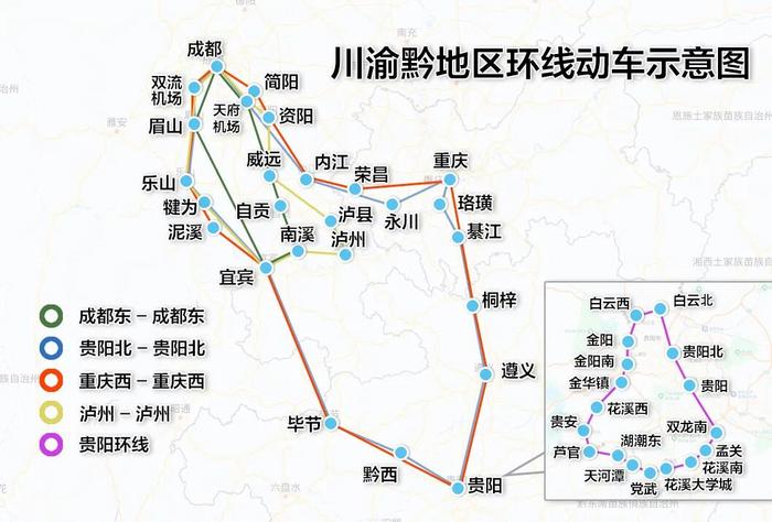 依托成贵高铁、成渝城际铁路、成自宜高铁、渝昆高铁渝宜段、贵阳环线铁路等线路,成都东、重庆西、贵阳北、泸州等多站已开行环线列车,一趟列车即可串联起川渝黔核心城市群,织就一张覆盖两省一市的“流动交通网”。