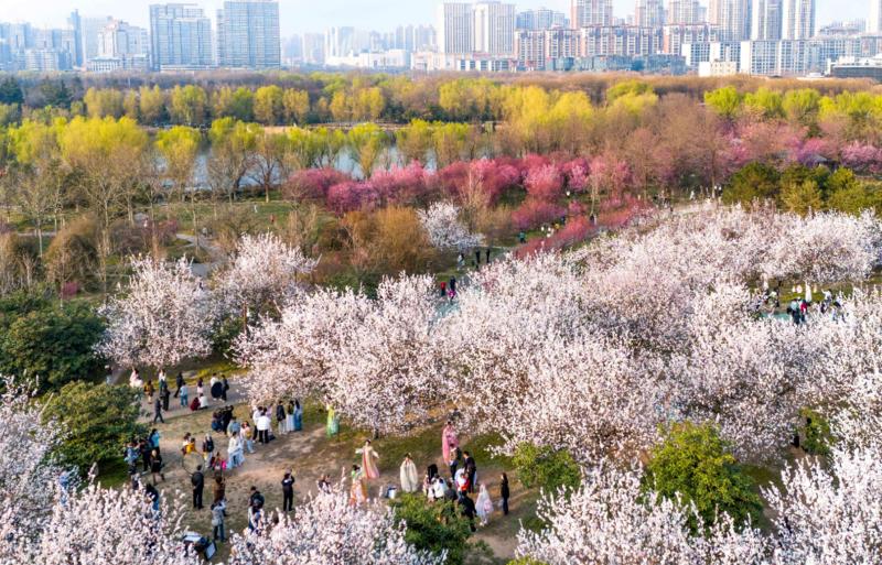 3月11日,游客在贵州省贵安新区樱花园内赏花游玩(无人机照片)。新华社记者 陶亮 摄