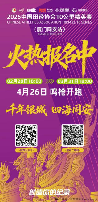 据悉,赛事报名时间为2月28日18:00至3月31日18:00,更多赛事详情及报名通道,可关注赛事官方公众号“梦想體育DreamSports”或扫描报名二维码即刻参与。千年银城启新程,四海跑者聚同安,这场融合专业与美景的10公里精英赛,期待全国跑者齐聚同安湾,跑出属于自己的精彩纪录。