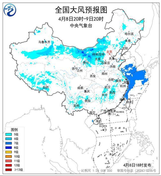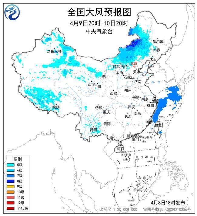 预计,4月8日20时至9日20时,新疆北疆东部和南疆盆地、甘肃河西、内蒙古中西部、宁夏中北部、陕西北部、山西中北部以及辽宁中部、云南东部、西藏中西部等地有5~7级大风,阵风7~8级;黄海中部和南部海域、东海北部和西南部海域将有7级、阵风8级的风。