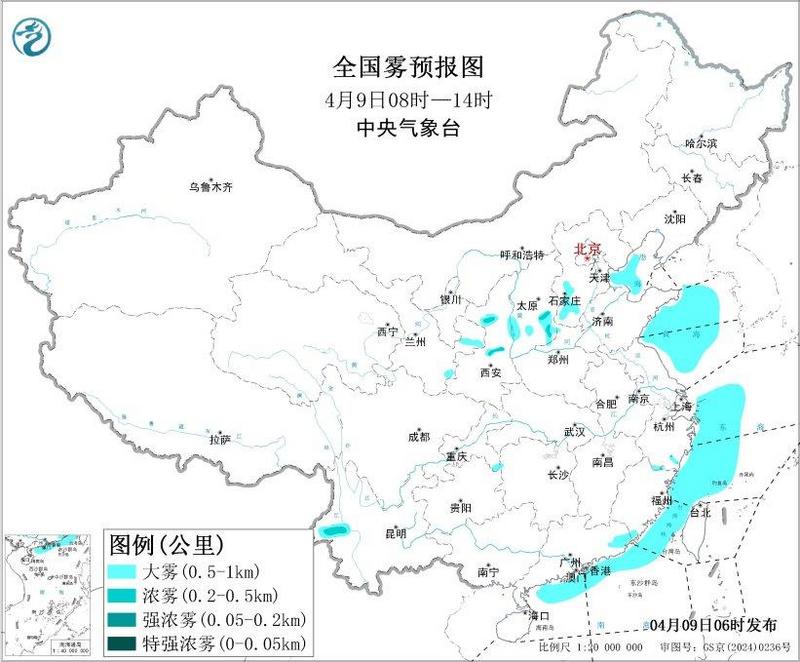 预计,4月9日早晨至4月10日早晨,渤海西部海域、黄海中部和南部海域、成山头附近海域、山东半岛沿岸海域、东海西部海域、台湾海峡、广东东部沿岸海域将有能见度不足1公里的大雾。此外,9日早晨至上午,河北南部、山西南部、陕西中北部等地的部分地区有大雾天气,局地有能见度不足500米的浓雾。
