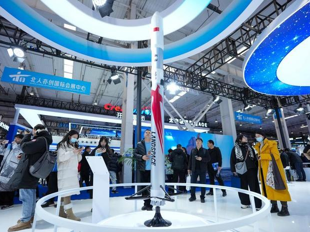2026年1月23日,观众在2026北京国际商业航天展的蓝箭航天展台参观展出的朱雀三号重复使用运载火箭模型。新华社记者 鞠焕宗 摄