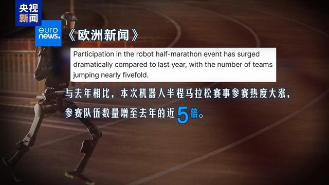 《欧洲新闻》报道说,与去年相比,本次机器人半程马拉松赛事参赛热度大涨,参赛队伍数量增至去年的近5倍。